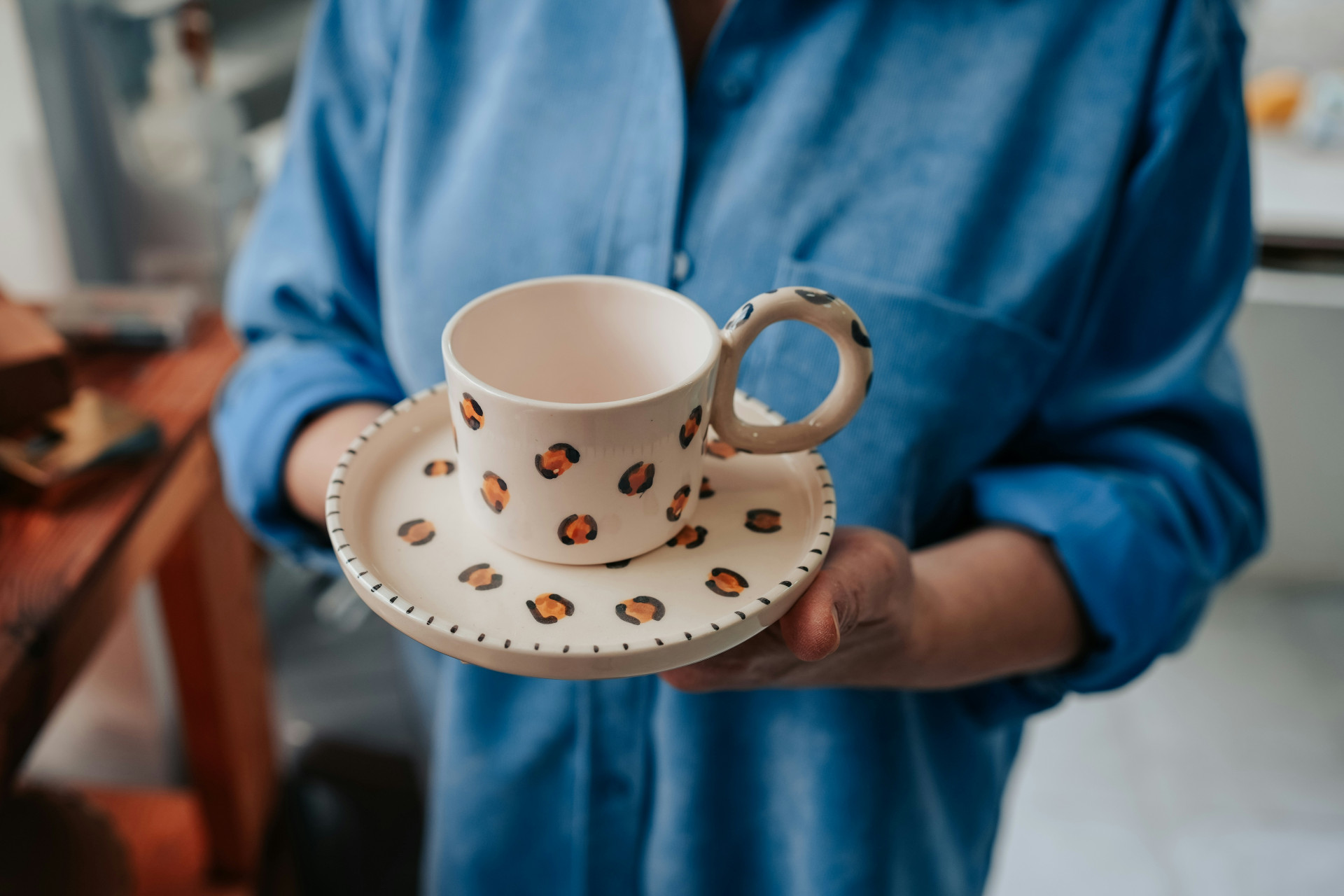 Ett fat kan antingen matcha koppen i färg och mönster eller skapa kontrast för ett mer personligt uttryck. Om du har ett neutralt kaffeporslin kan du tillföra karaktär med fat i en annan nyans eller med ett diskret mönster.